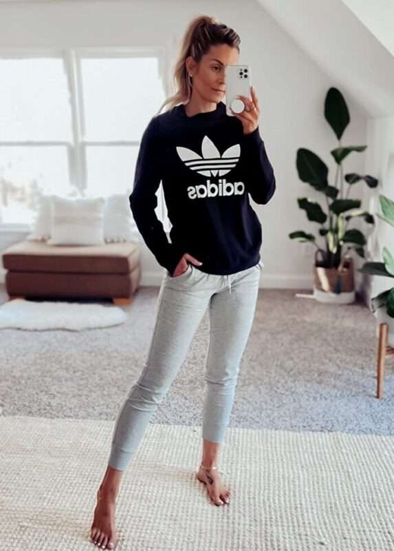 For a sport-inspired loungewear appearance, a sporty Adidas ensemble with grey joggers is an excellent choice. The athletic flair keeps it energized, while the joggers guarantee maximum comfort. Adding a fitted hoodie or a trendy bomber jacket makes this outfit ready for the street and effortlessly stylish.
