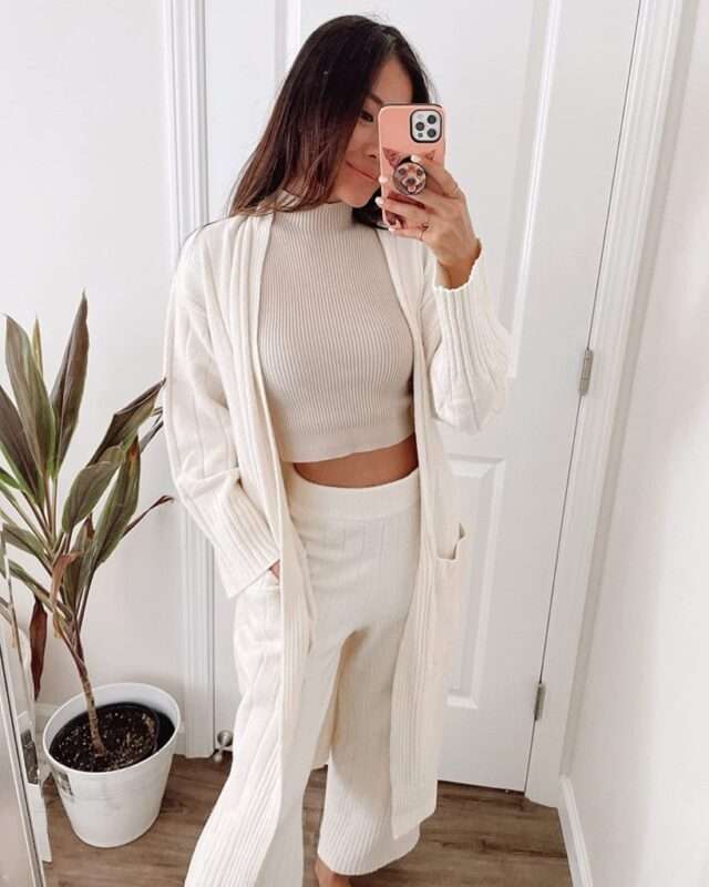 Nothing screams elegant loungewear like a white sweater set teamed with a large coat for extra warmth and sophistication. As one of the most stylish Loungewear Outfit Ideas, the ensemble is elevated with fashionable booties, making it perfect for cozy nights indoors or casual winter outings. The texture contrast brings depth to this effortlessly luxurious outfit.