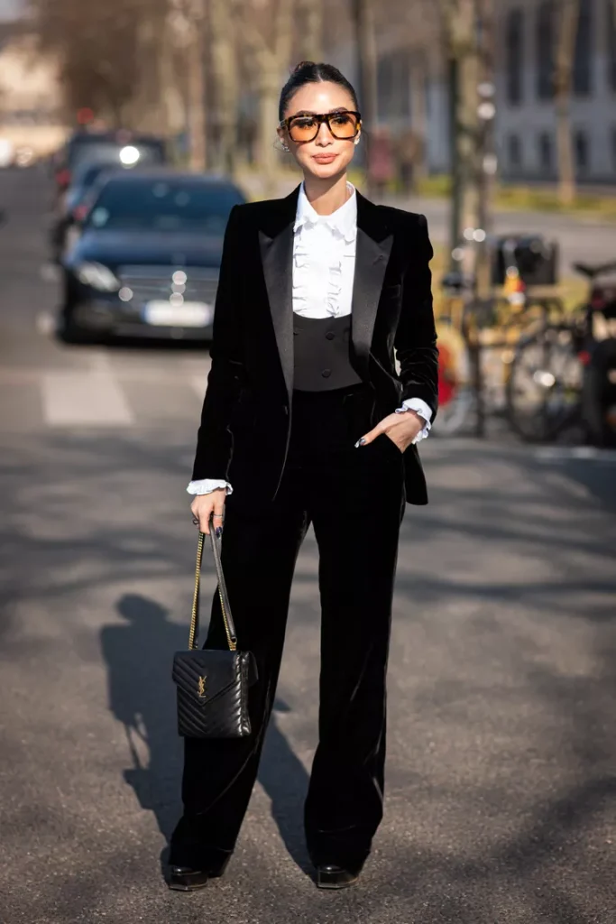 For a striking yet graceful dinner outfit inspiration, consider a blazer dress complemented by bold earrings. The sharp silhouette of the blazer dress, along with the dramatic flair of bold accessories, provides a powerfully chic appearance for any upscale dining occasion.