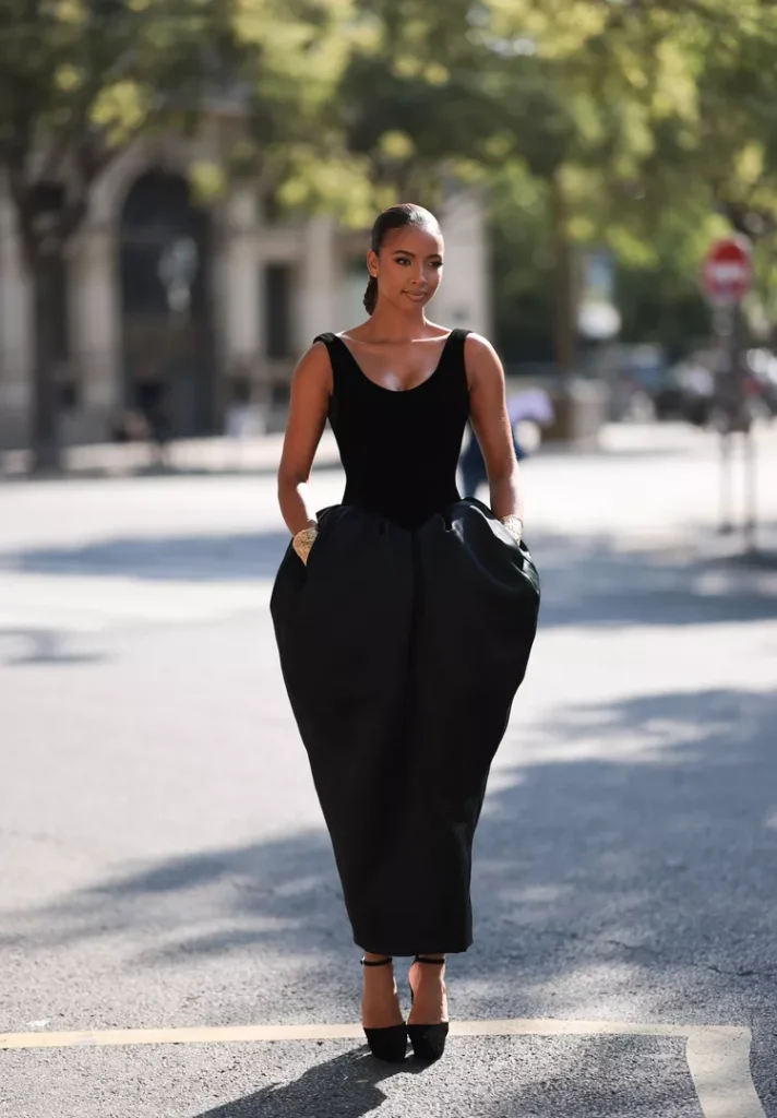 A tulle skirt combined with a velvet bodysuit creates a playful yet sophisticated dinner outfit idea. The delicate tulle adds dimension, while the velvet bodysuit ensures a stylish and comfortable look for any festive dining occasion.