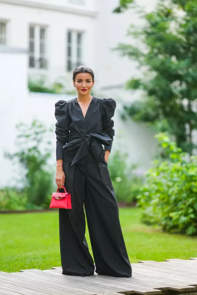 A bell-sleeve blouse paired with palazzo pants presents a dinner outfit idea filled with elegance and fluidity. This easy-going yet fashionable pairing is suitable for a chic dinner occasion where comfort and refinement are key.
