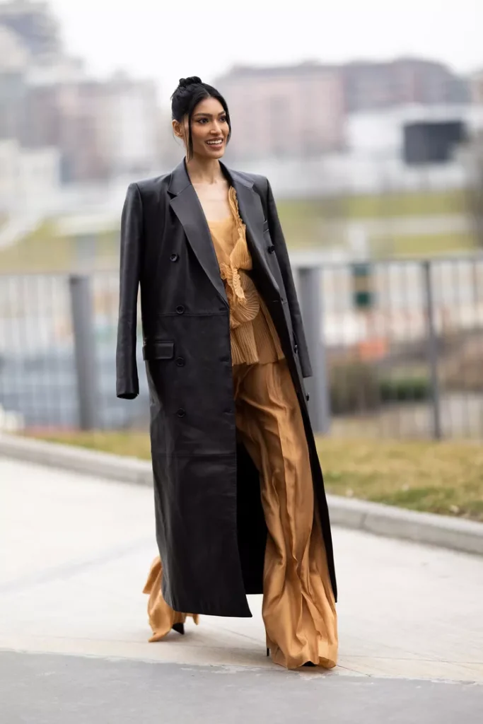 A slip dress combined with a leather jacket forms the perfect dinner outfit inspiration for a chic yet edgy facade. This pairing strikes a balance between softness and strength, making it suitable for a night out with friends or a casual dining event.