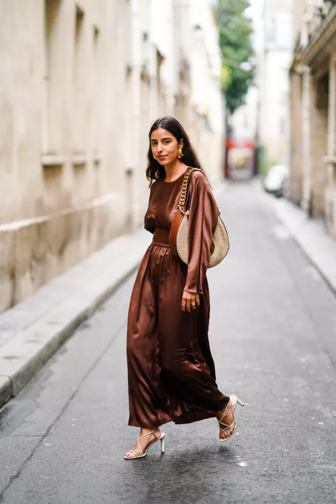 A lavish silk wrap dress paired with metallic heels is the ultimate dinner outfit inspiration for a chic, contemporary look. This ensemble exudes sophistication and refinement, making it perfect for upscale dining events or a night out.