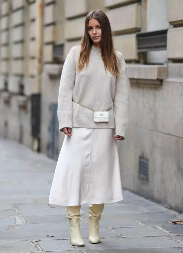 A midi skirt is ideal for winter when styled with tights and a warm sweater. This outfit provides a sophisticated appearance for casual winter outings, merging style with functionality. Combine it with knee-high boots and an elegant coat for a complete, fashionable winter outfit.