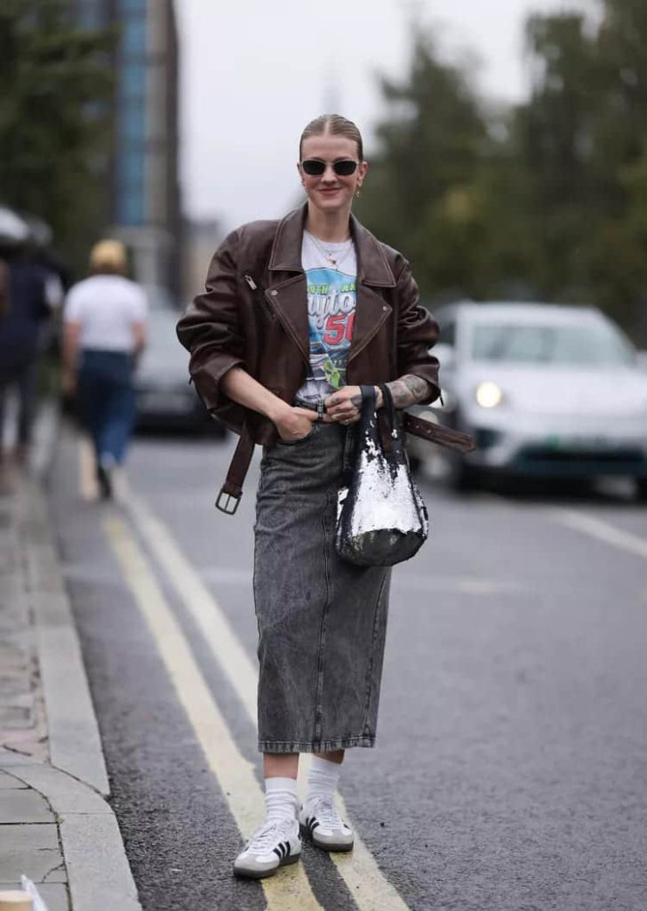 The denim skirt doesn’t need to be limited to summer. A long-sleeve shirt, leggings, and boots create a winter-ready iteration of this classic staple. Denim skirts layered with warm clothing make for fantastic casual winter outfits that are both practical and stylish.