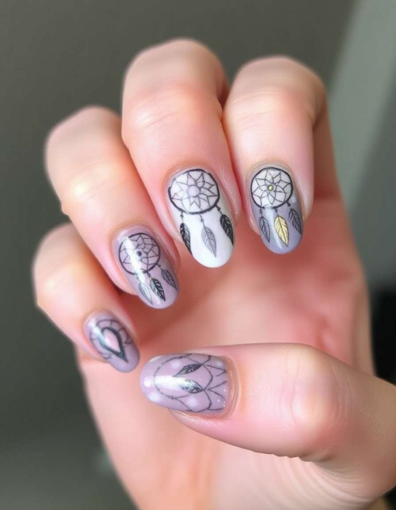 Boho nails embellished with hand-painted dreamcatcher designs bring forth a mystical and spiritual essence. The soft, neutral base allows the intricate details of the dreamcatcher to shine, making these nails perfect for lovers of symbolic and artistic boho designs.