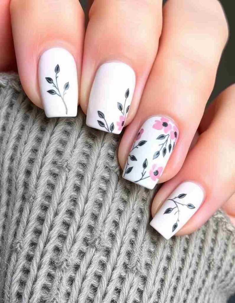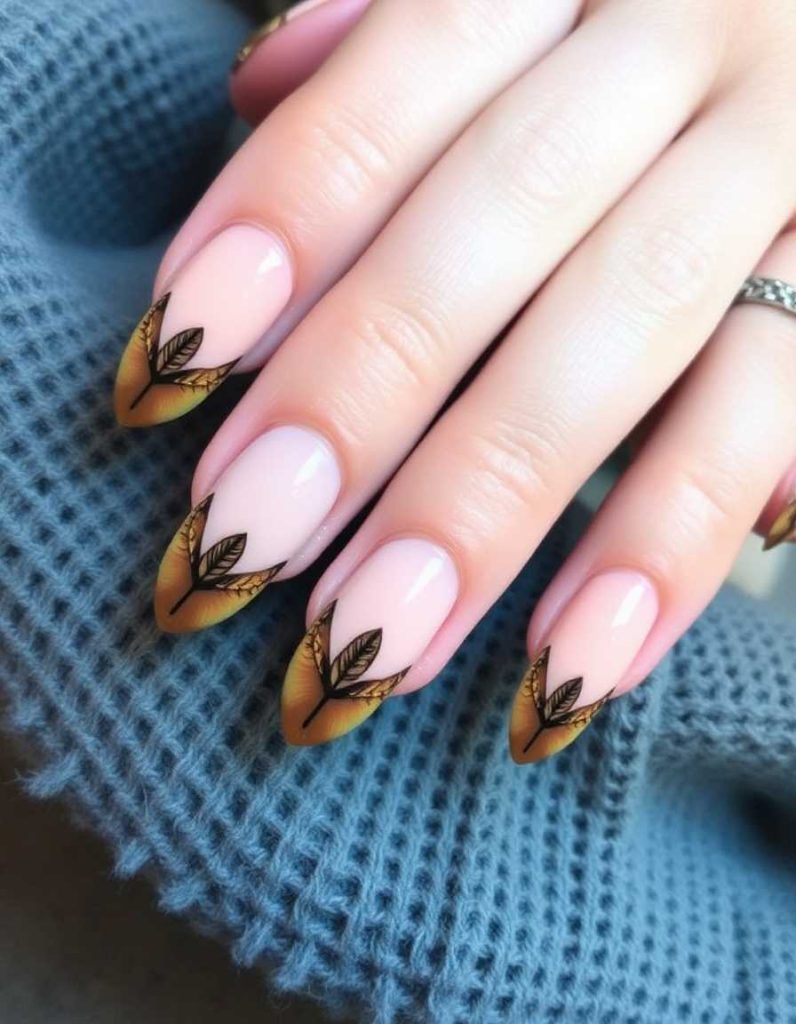 Boho nails in brown and beige colors, accented with small floral or leaf designs, evoke a natural, earthy ambiance. This style captures the beauty of nature and embodies a rustic boho feel that’s perfect for outdoor enthusiasts.