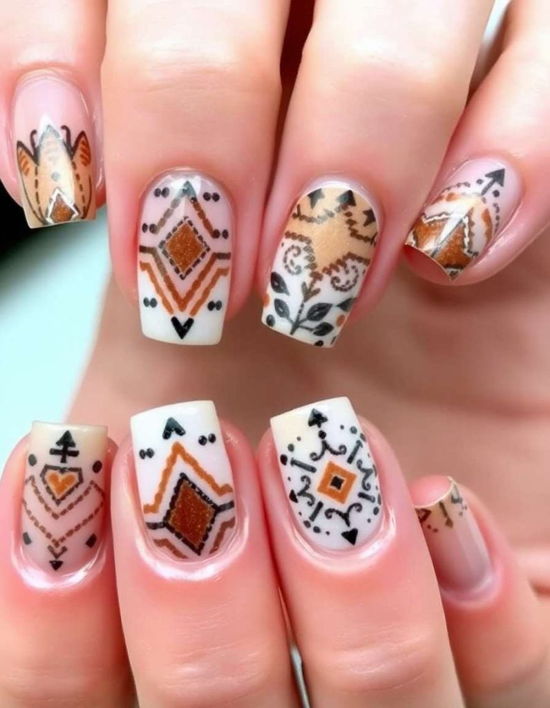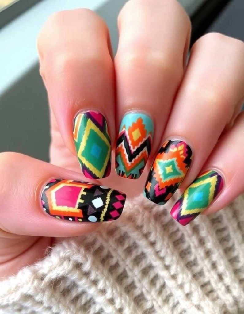 Boho nails showcasing striking Aztec-inspired geometric designs pair vibrant hues with neutral backgrounds. This attention-grabbing style is perfect for those wishing to infuse bold, cultural motifs into their bohemian nail artistry.
