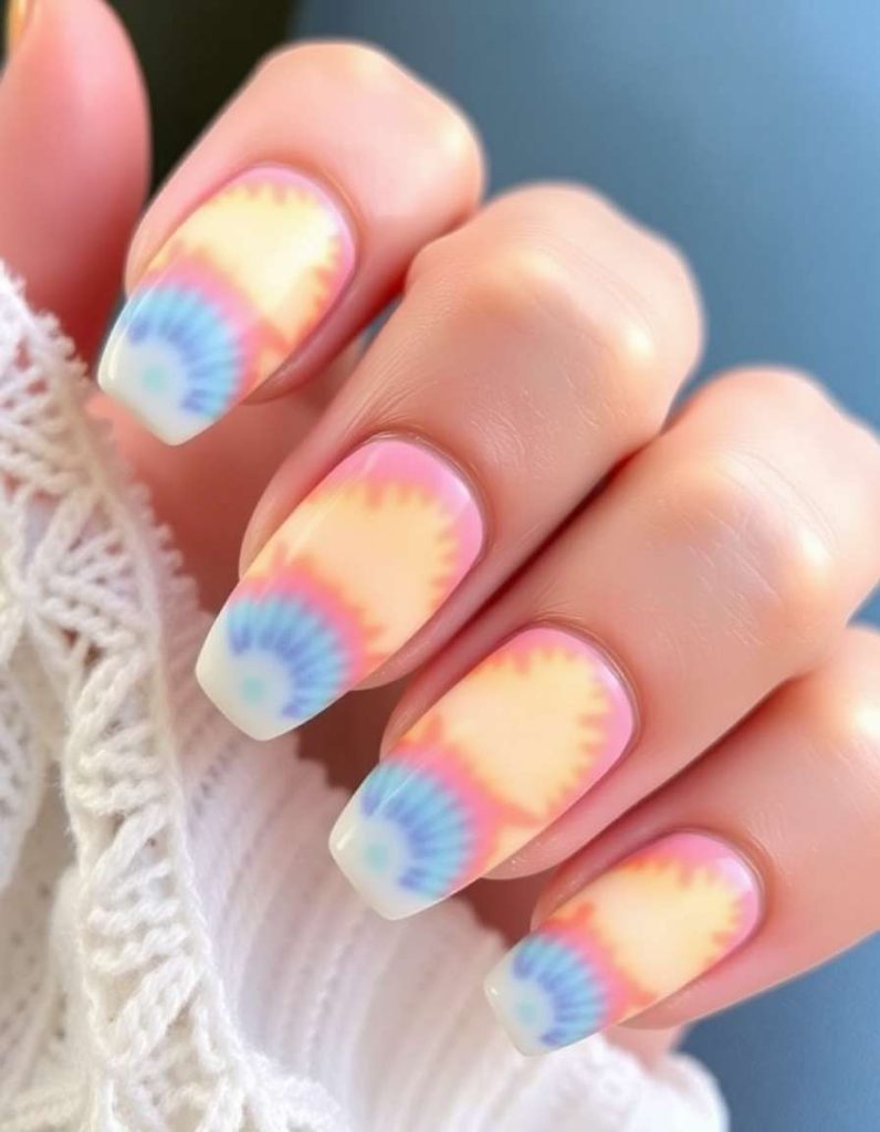Boho nails displaying tie-dye patterns in soft, rainbow shades exude a laid-back, groovy atmosphere. This colorful and playful design captures the carefree essence of boho style and adds a whimsical element to your nails.