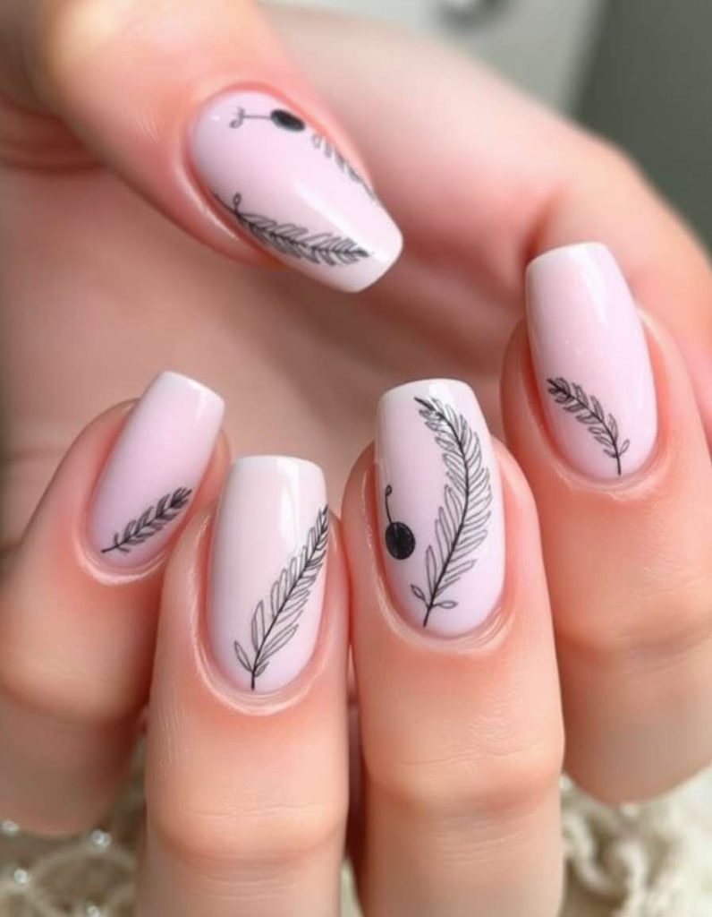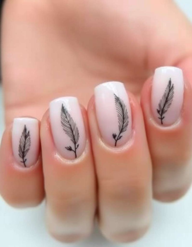 Boho nails adorned with delicate feather motifs in neutral tones create a soft and free-spirited appearance. Detailed, hand-drawn feathers reflect the bohemian style, making them a delightful choice for those who enjoy whimsical and nature-inspired nail designs.