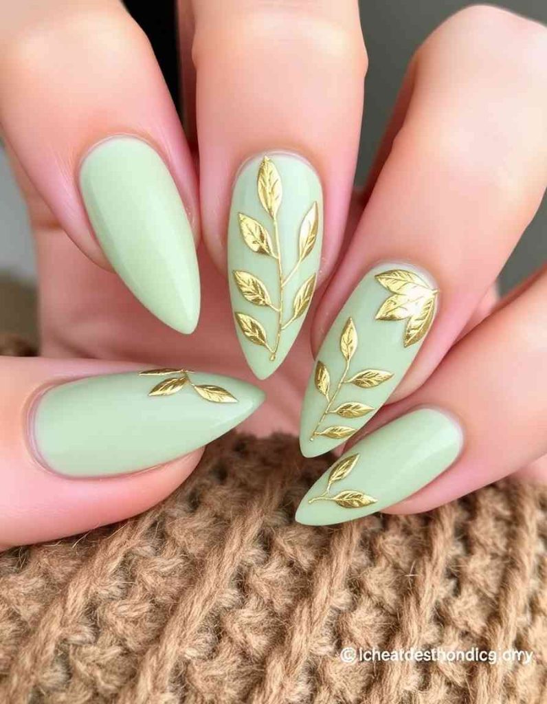 Boho nails featuring a sage green base and gold leaf accents merge earthy and refined tones. The soft green hues and delicate gold highlights create a chic, bohemian vibe that’s both serene and sumptuous.