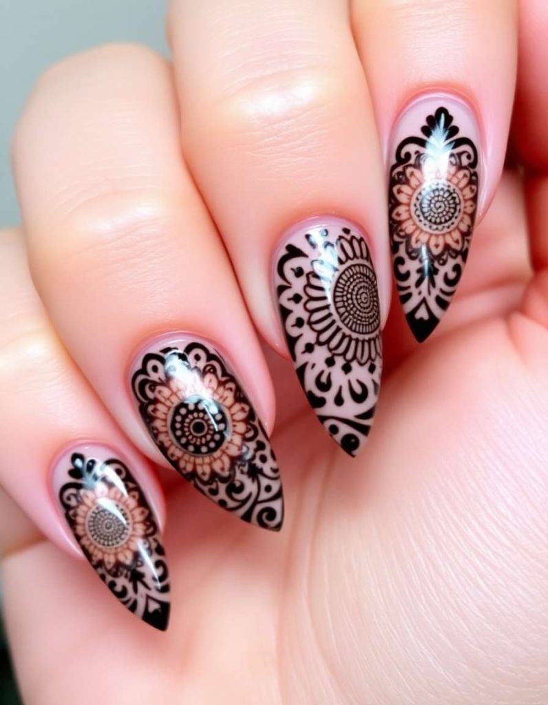 Boho nails featuring henna-inspired artwork present intricate designs with a cultural and spiritual essence. The detailed motifs and earthy tones make these nails ideal for individuals who admire artistic, boho-chic nail expressions.