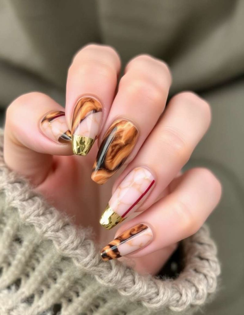 Boho nails featuring marble designs in earthy shades paired with gold foil accents generate a lavish yet grounded appearance. The marble effect imparts a rustic elegance to these nails, ideal for adding a sophisticated boho flair to your style.