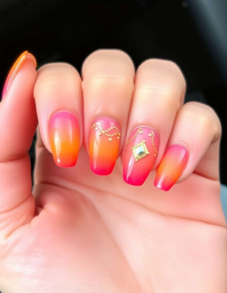 Boho nails featuring a gorgeous orange-to-pink gradient, reminiscent of a sunset, embellished with gold accents. This vibrant and warm design brings boho allure to your nails, creating a lively and radiant appearance that’s ideal for any free-spirited event.