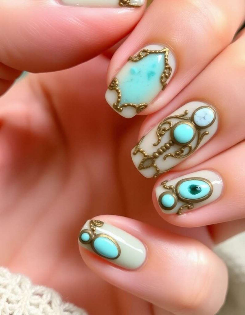 Boho nails showcasing turquoise gemstone designs introduce a natural and sophisticated element. The striking turquoise against earthy hues creates a stylish and bohemian-inspired aesthetic, ideal for adding a burst of color and tranquility to your nails.