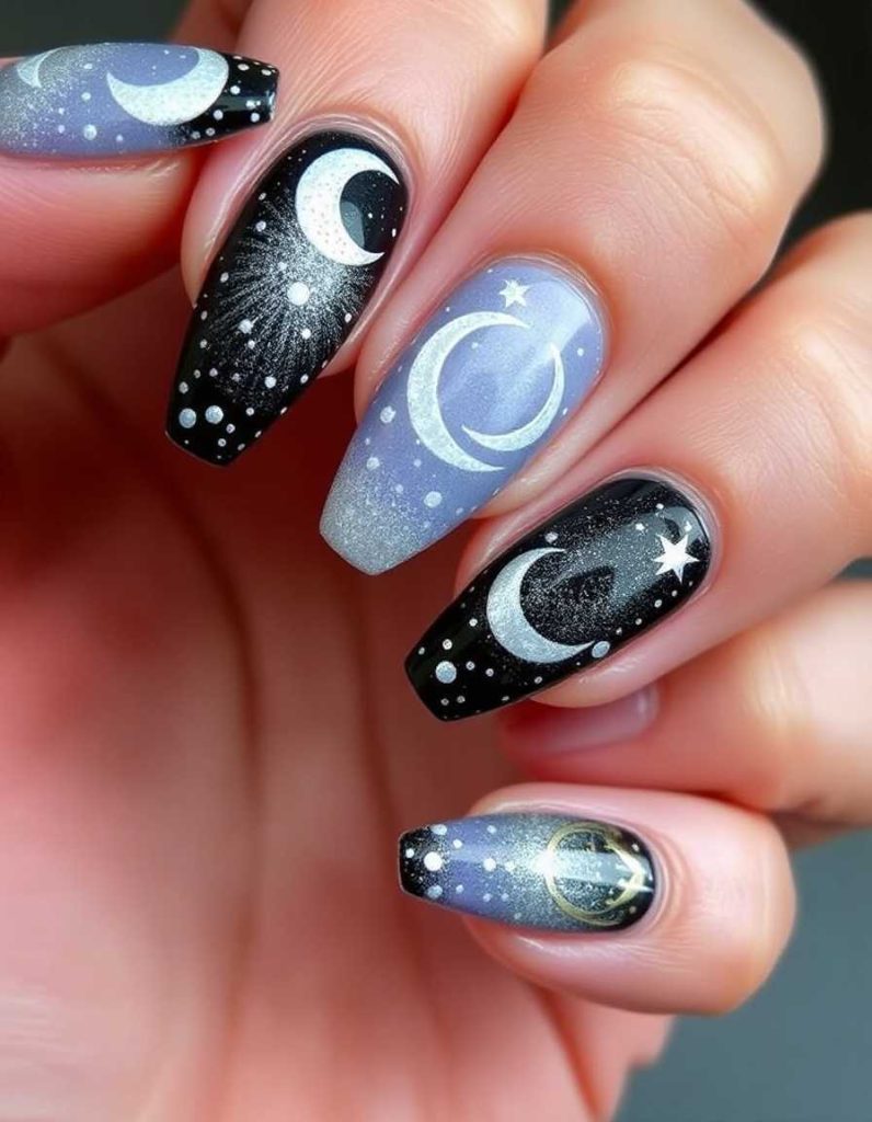 Boho nails featuring celestial motifs like moons and stars, accentuated with glitter, evoke a mystical, ethereal feel. These nails embody the adventurous boho lifestyle with a hint of cosmic charm, perfect for anyone looking to incorporate a bit of enchantment to their nail artistry.