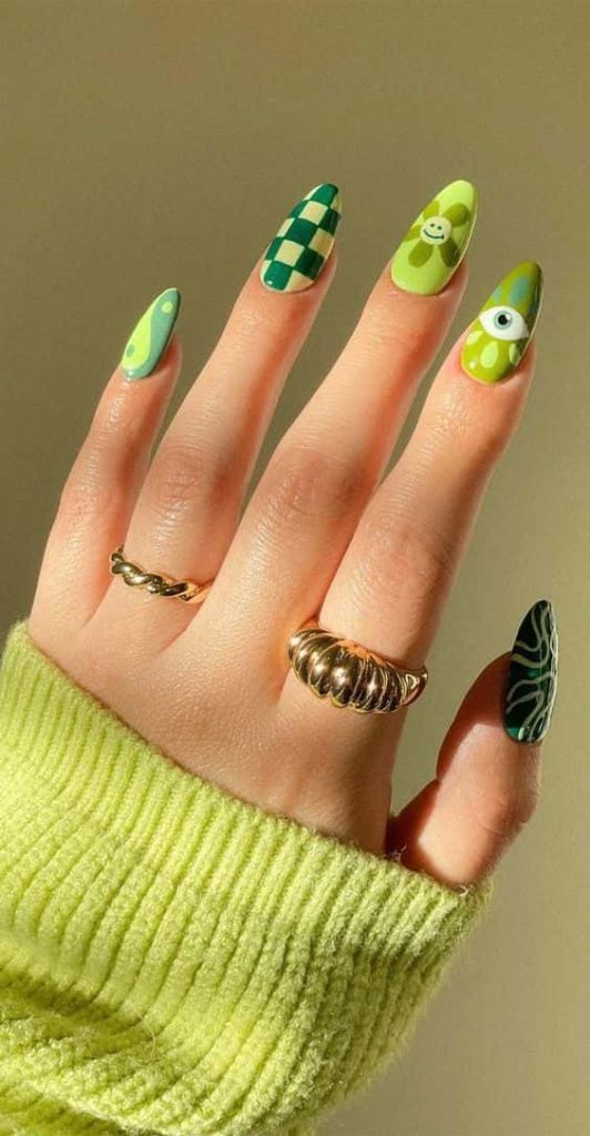11. Green Checkered and Eye-Inspired Almond Nails Design