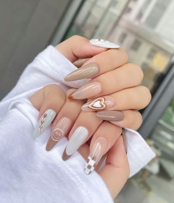 Add a dash of affection to your manicure with almond acrylic nails in cozy coffee tones, highlighted with charming heart details. This design feels warm yet fashionable—perfect for autumn atmospheres or romantic occasions. It’s both endearing and chic in the best ways.