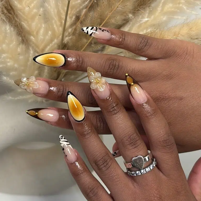 Merge sophistication and sparkle with this glitzy marble and ombre almond acrylic nail design. The flowing designs and shimmering gradients create an enchanting appearance. It’s a statement-making look that’s both classy and opulent. Ideal for celebrations, this design adds texture and brilliance in all the right areas.