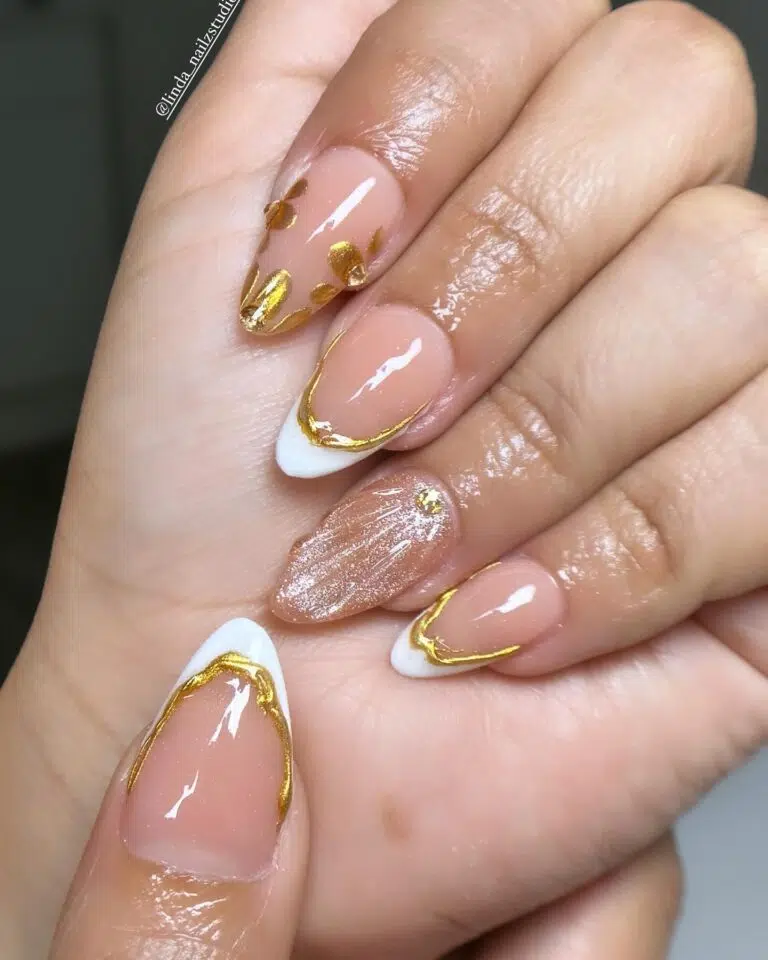 These transparent almond acrylic nails are embellished with delicate gold leaf or sprout-like decorations that impart the perfect touch of shimmer. The clear base offers a contemporary, airy feel while still radiating elegance. It’s ideal for a minimalist who enjoys understated glamour.