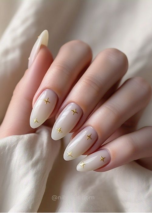 These fashionable almond acrylic nails showcase a dreamy milky white base adorned with tiny, twinkling stars. It embodies the perfect celestial aesthetic that exudes both elegance and whimsy, particularly for stargazers and minimalists alike. This soft, contemporary appearance brings a refreshing twist to traditional nail designs while retaining its subtle beauty.