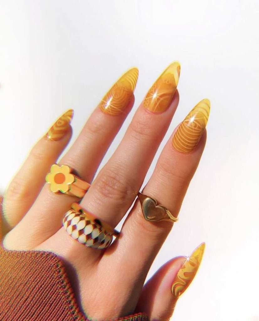 Rich caramel yellows merge with swirling accents in this ultra-stylish hippie nails appearance. It’s an ideal color combination for individuals who appreciate earthy, soothing tints with a hint of retro nostalgia. Subtle yet striking, this design infuses relaxed sophistication into your look.