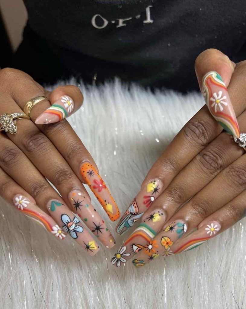 Extended acrylic nails serve as canvases for vibrant blossoms, peace symbols, and psychedelic patterns. These hippie-inspired nails convert every fingertip into a work of art, resonating with retro vibes while incorporating a contemporary flair. They are daring, expressive, and embody the bohemian spirit.