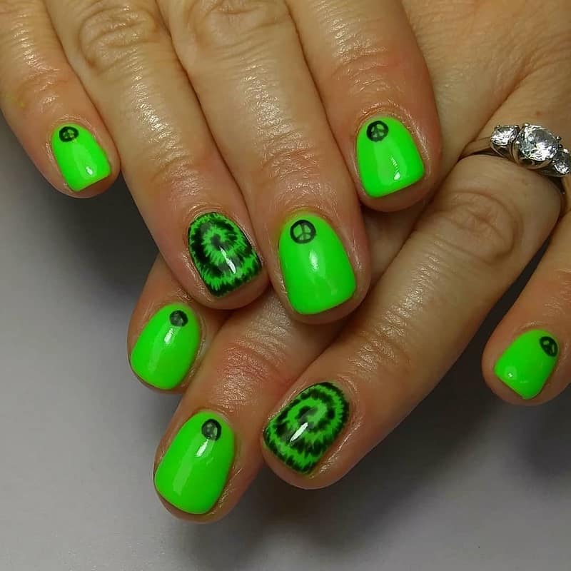 Vivid lime green infuses a contemporary twist into a tie-dye hippie nails design that is both fierce and fashionable. Flowing shades maintain an artistic essence while the neon accent radiates confidence. This style is essential for daring, vibrant personalities.