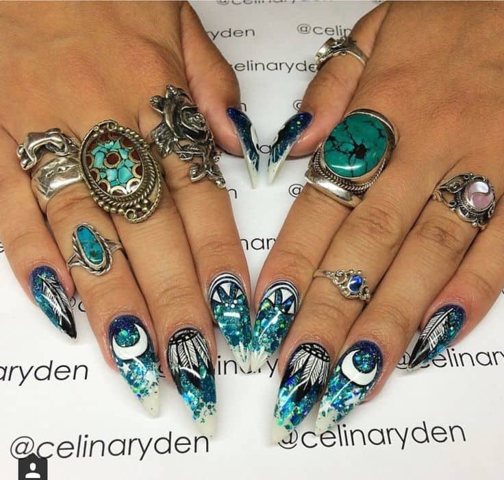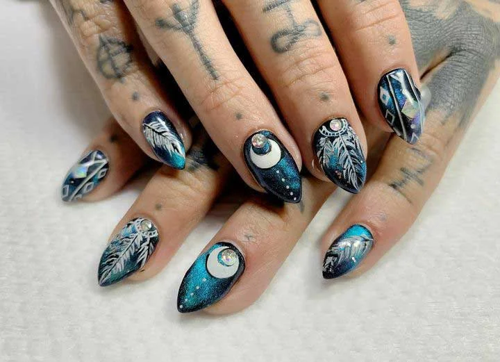 7. Mystical Moon & Feather Hippie Nails