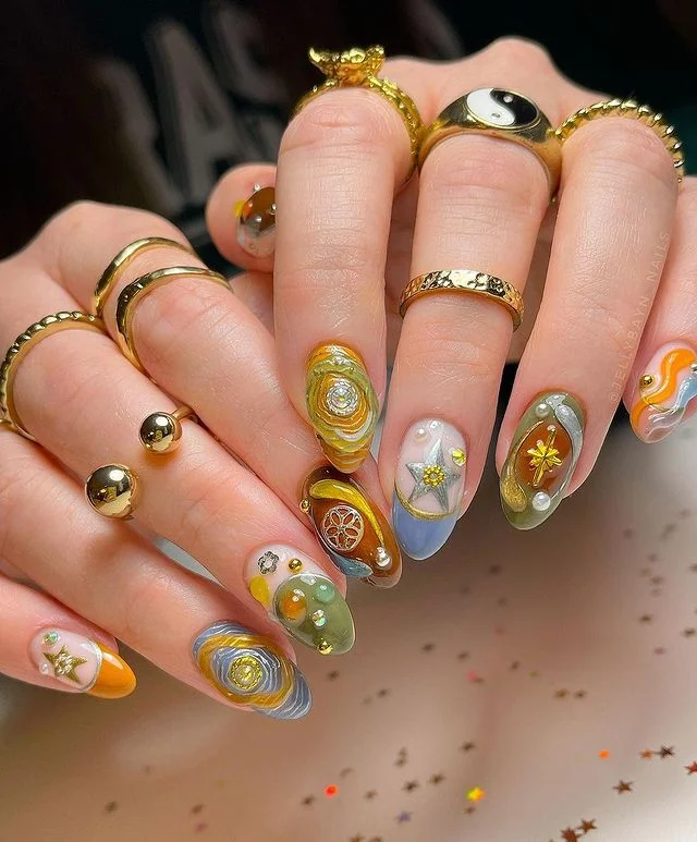 Deep swirls, mystical forms, and rich shades establish a moody, enigmatic interpretation of hippie nails. Drawing inspiration from cosmic concepts, this style fuses an edgy aesthetic with spiritual depth. Perfect for night owls and celestial enthusiasts alike.