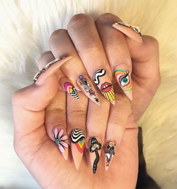 Pointed stiletto nails converge with bohemian creativity, showcasing a sharp and fashion-forward hippie nail style. From whimsical tie-dye to tribal details, every nail commands attention. A bold appearance for the daring and artistic spirit.