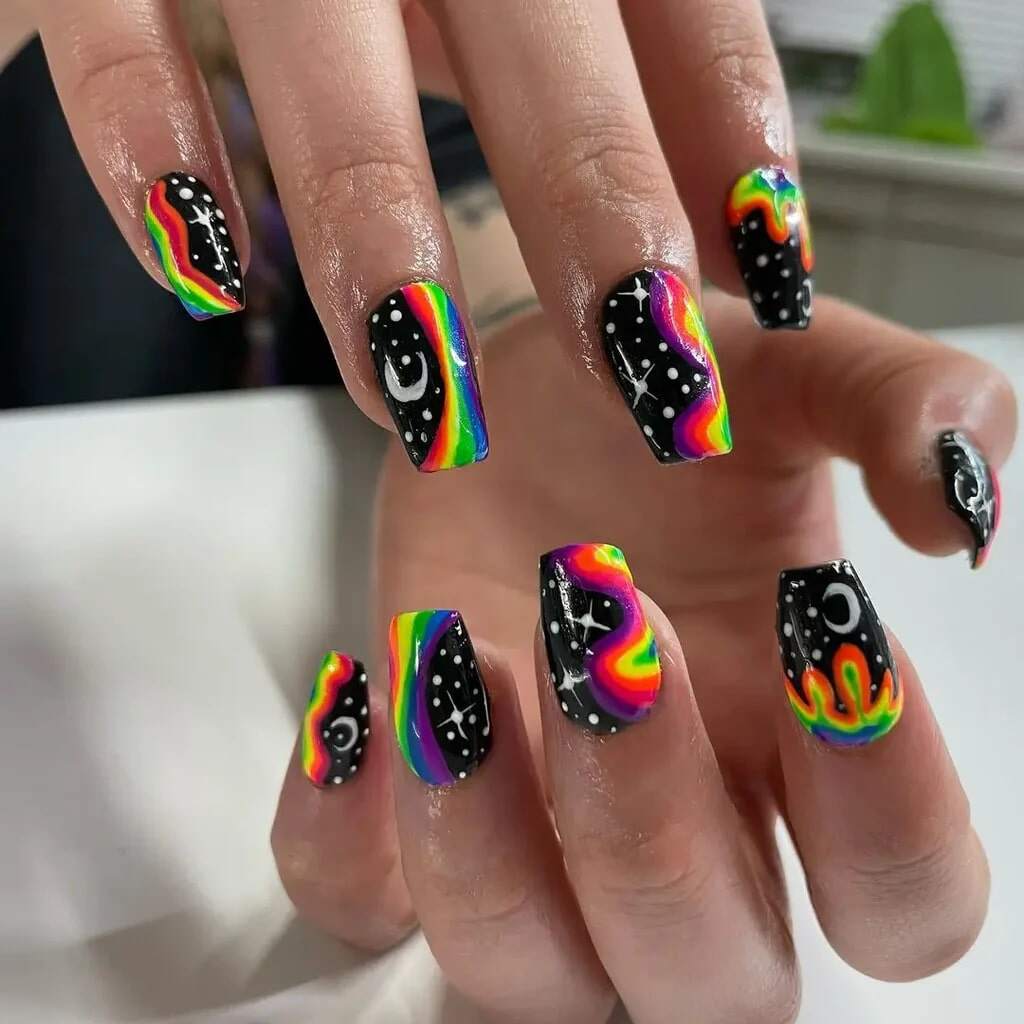 Outlandish aliens combine with coffin shapes and rainbow shades for the boldest interpretation of hippie nails yet. This style merges extraterrestrial appeal with free-spirited artistry—perfect for anyone seeking a funky, alternative aesthetic. Adorn some rings and you’ll embody cosmic chic.