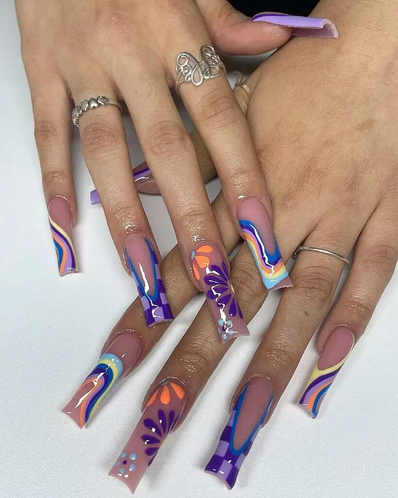Striking shapes and colorful artistry come to life in these long, eye-catching hippie acrylics. Ideal for those seeking drama and intricacy, this style emanates vintage soul and creative flair. A festival-ready masterpiece that you can flaunt daily.