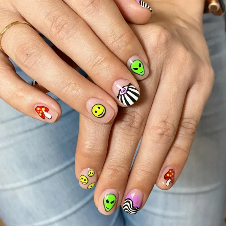 Welcome the unexpected with alien motifs and whimsical mushrooms, creating an eccentric, psychedelic look for your hippie nails. This design channels cosmic vibes and nature’s untamed energy, adding festival flair to your fingertips. It’s fun, daring, and perfect for those who enjoy standing out.