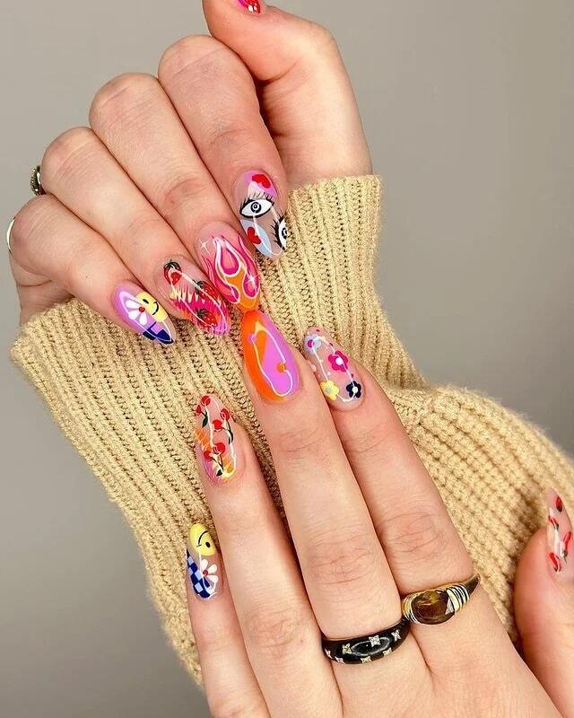 3. Lively Hippie Nail Design with Psychedelic Motifs