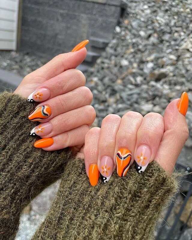 4. Bright Orange Floral Hippie Nail Art