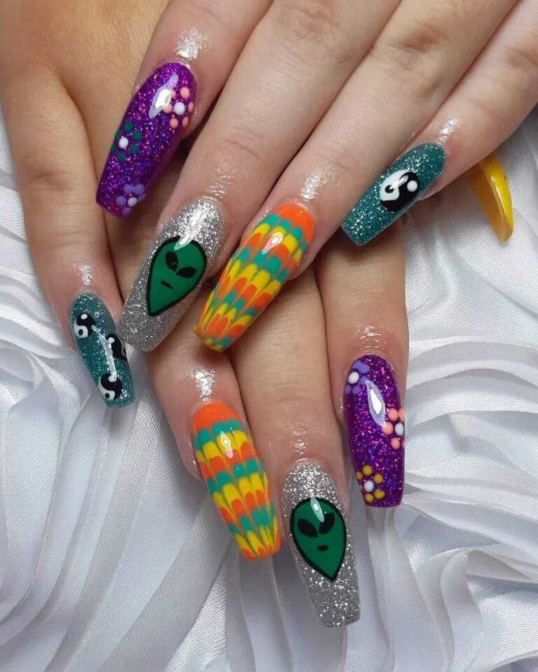 6. Colorful Alien Hippie Coffin Nails