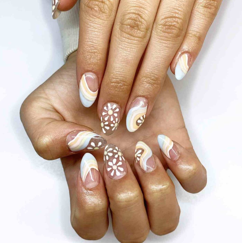 Fresh blooms, pastel hues, and cheerful designs unite in these hippie nails, celebrating the essence of spring in full abundance. It’s a whimsical design that perfectly complements sunny days and boho-inspired dresses. A light and invigorating way to display that carefree spirit.