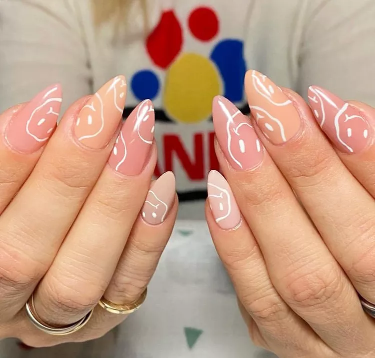 This playful design injects a splash of personality into your natural nail styles with hand-drawn smiley faces. The uneven shapes over nude polish maintain an artsy and enjoyable vibe. It’s a cheerful, relaxed take on minimalist nail trends.