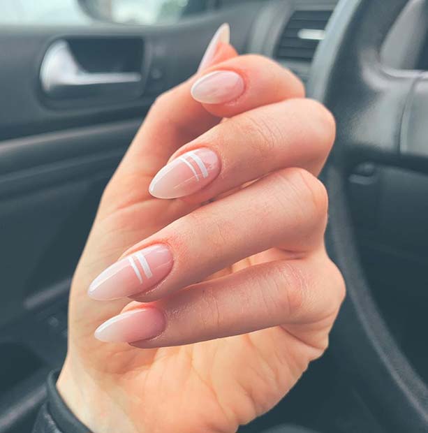 White stripes introduce a whimsical element to otherwise understated natural nail designs. This appearance strikes a balance between clean simplicity and a hint of artistic flair, all while remaining within neutral color schemes. Perfect for those who appreciate delicate nail art without vibrant colors.