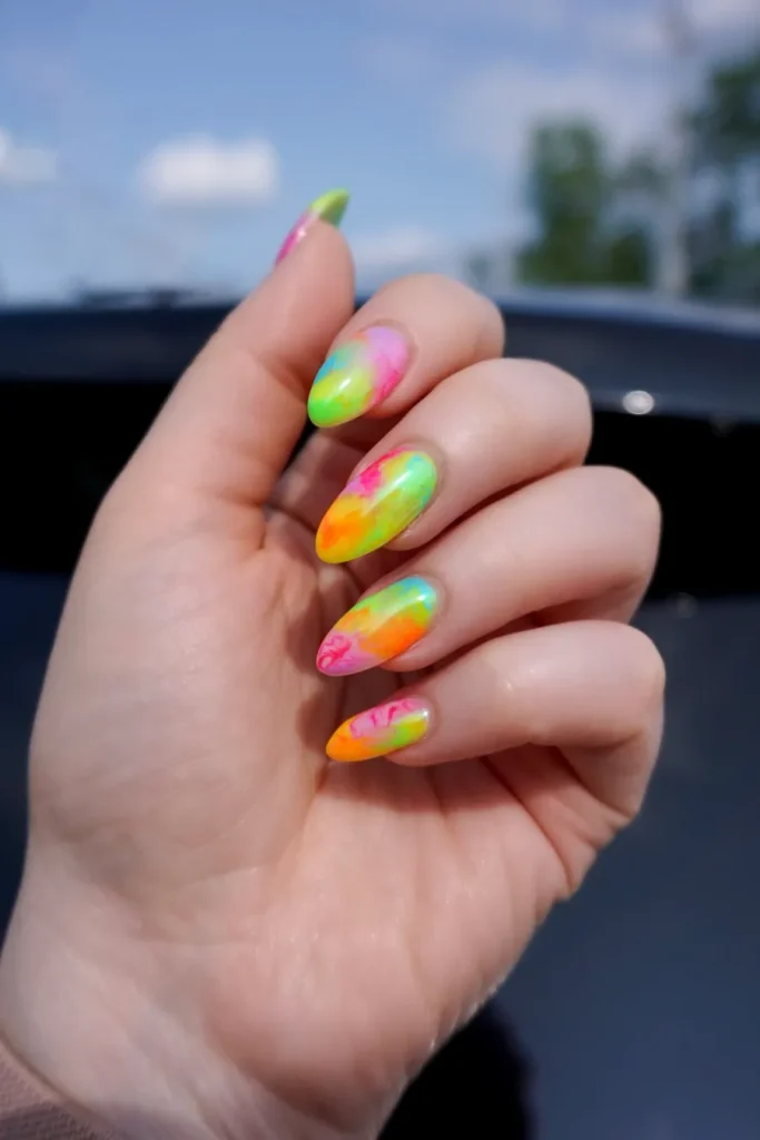 These April nail concepts exude vibrant energy through colorful tie-dye patterns. The swirling fusion of hues creates a distinctive, striking appearance, ideal for embracing the playful essence of spring. Whether in pastels or bright colors, this look is bound to captivate.