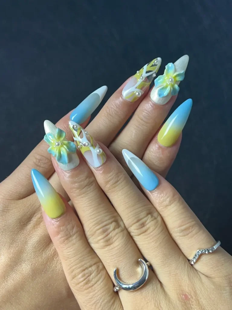 Gentle and exquisite, these April nail designs capture the allure of spring with soft yellow tones and floral embellishments. The understated yet sophisticated style embodies the essence of blooming flowers, making it a must-try seasonal look. Whether you appreciate delicate details or minimalist charm, this manicure provides a fresh update for spring.