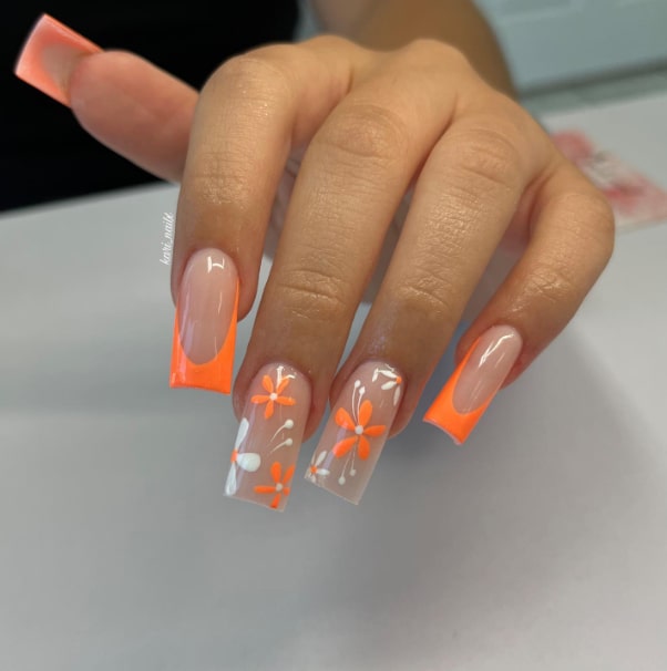 24. Vibrant Orange Floral Nail Art