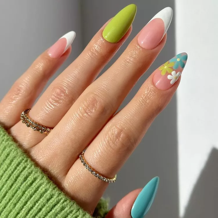 Blending various shades of green, these April nail concepts highlight a trendy mismatched aesthetic. The tonal diversity creates a fresh, contemporary appearance that harmonizes perfectly with the vibrant spirit of spring. Whether glossy or matte, this design adds a distinctive, nature-inspired vibe to your manicure.