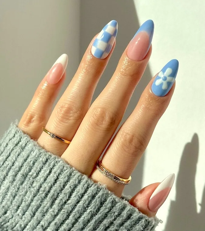 Stylish and contemporary, these April nail trends manipulate negative space and vivid blue silhouettes for a bold effect. The sharp yet graceful design adds dimension and contrast, forging a manicure that effortlessly distinguishes itself. This style is ideal for individuals who value minimalist yet striking nail artistry.
