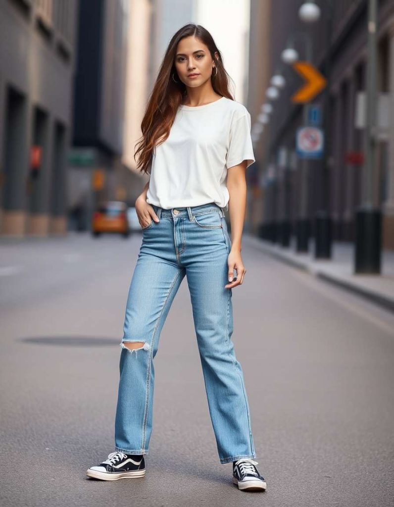 Straight-leg jeans are a timeless selection in streetwear attire, providing a relaxed yet tailored silhouette. When combined with hoodies, t-shirts, or jackets, they forge adaptable ensembles perfect for any casual setting. This classic shape remains both effortless and stylish.