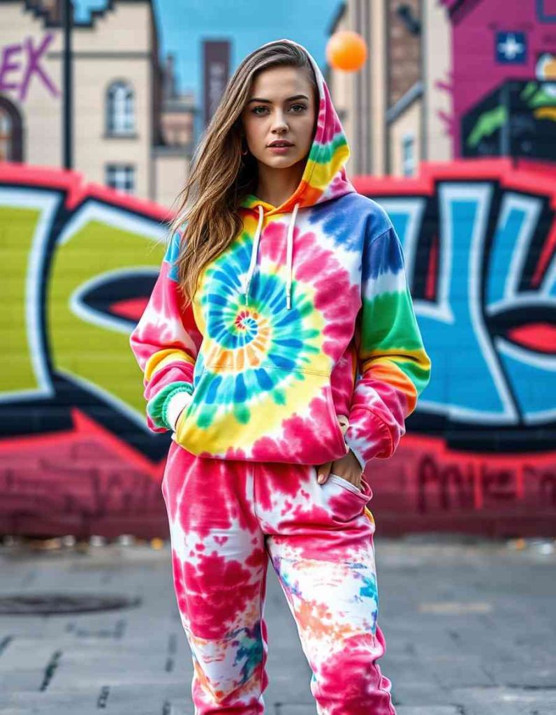 Tie-dye creations are a vibrant and dynamic aspect of streetwear fashion, ideal for showcasing individuality. Hoodies, t-shirts, or joggers adorned in bright tie-dye patterns add a playful, artistic flair to urban outfits. This trend stands out with its inventive style.