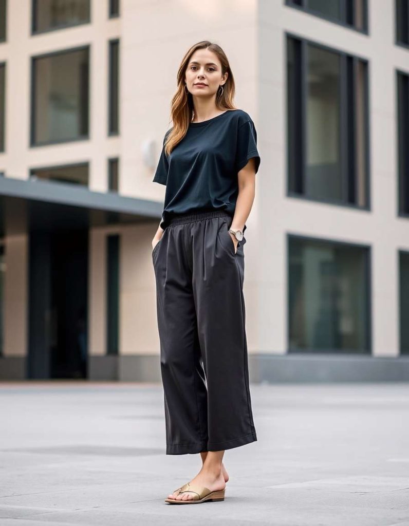 Wide-legged trousers add elegance to streetwear trends, providing a relaxed yet refined fit. Combined with basic tees or tank tops, they fashion versatile and stylish outfits. This silhouette is ideal for merging comfort with contemporary sophistication.