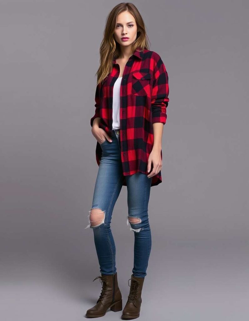 This timeless grunge ensemble showcases an oversized red and black flannel shirt teamed with distressed ripped jeans and boots. The look radiates effortless rebellion and style, making it ideal for a relaxed, edgy vibe. The soft background accentuates the outfit’s grunge essence, allowing it to shine in any casual setting.