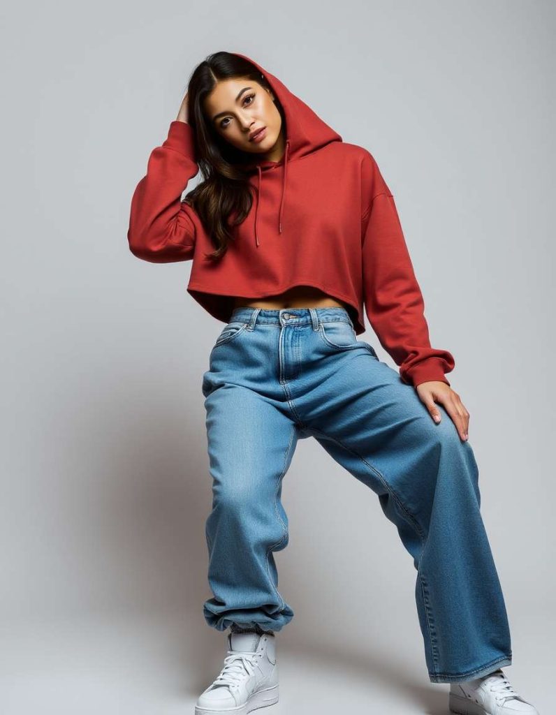 A cropped hoodie matched with loose jeans forms the ideal effortless grunge look. The roomy, laid-back fit provides both comfort and chic style, while thick-soled sneakers finish off the outfit. The neutral backdrop accentuates the casual coolness of this grunge combination.